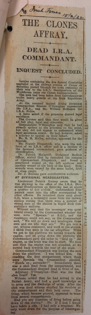 Fig 1: Irish Times report on Clones Affray; See also Military Service Pension Collection file of Matt Fitzpatrick.
